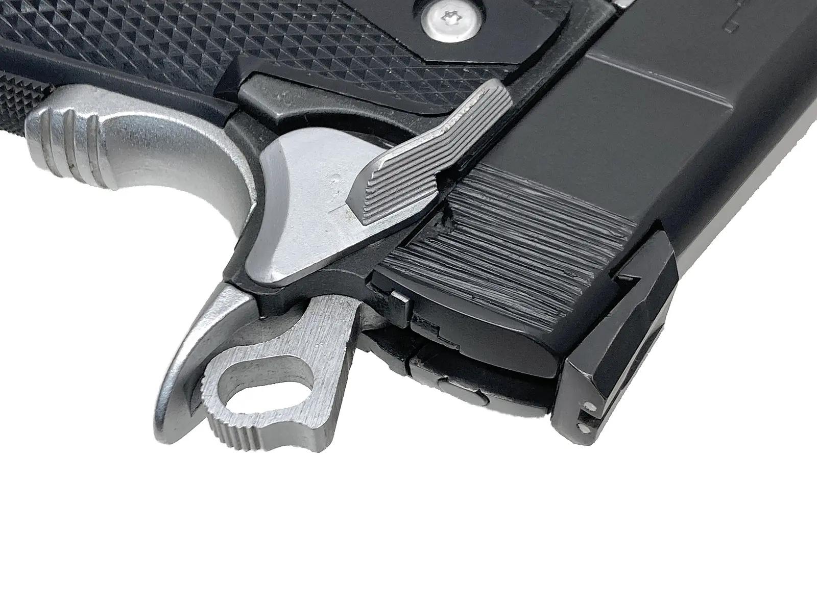 4.3インチの取り回しやすいサイズに、ソリッドな造形を凝縮したブラックモデル。剛性の高い金属製フレームを採用しており、コンパクトながらも手に伝わる確かな重厚感を備えている。直線的で近未来的なフォルムは、視覚的な美しさだけでなく、安定したホールド感にも寄与。装弾数は24発を確保し、シューティングなど様々な用途に対応可能だ。洗練されたデザインと実用的なスペックを高次元で両立させた、堅実な一丁である。