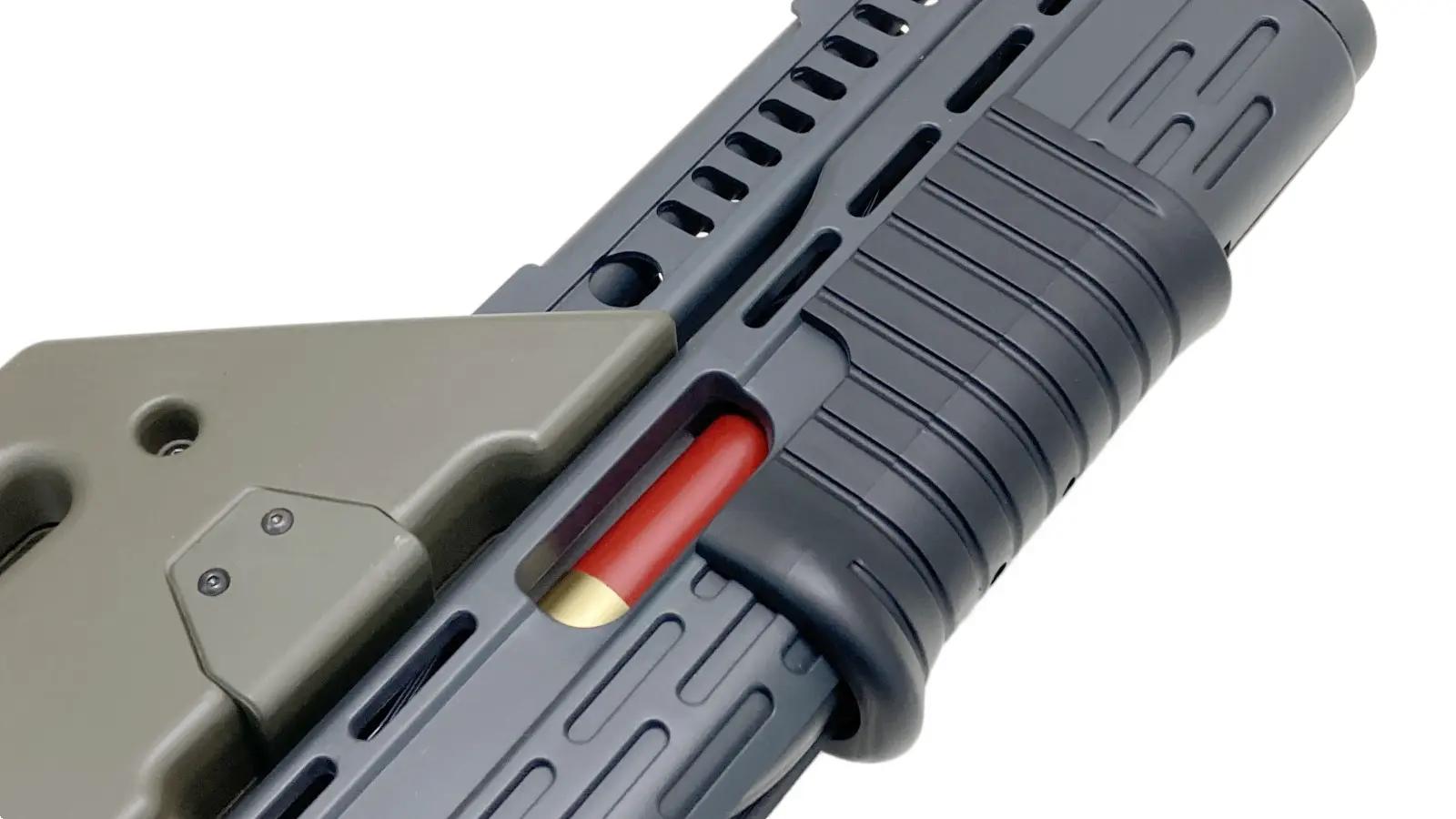 グレネードランチャー部分はダミーながらコッキングができ、赤シェルが覗くようになっています。