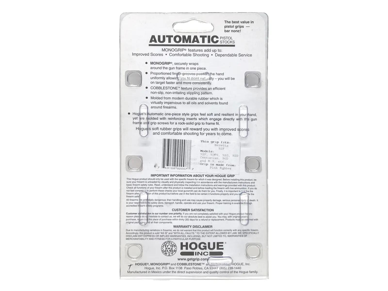 [HOGUE] BERETTA 92F ラバーグリップ・フィンガーグルーブ ピンク 92007 (中古)の販売ページ|エアガン.jp