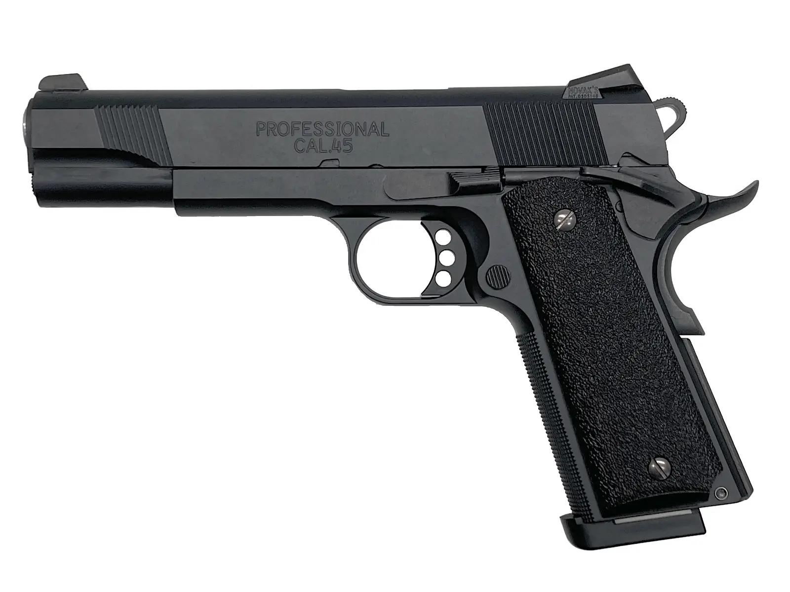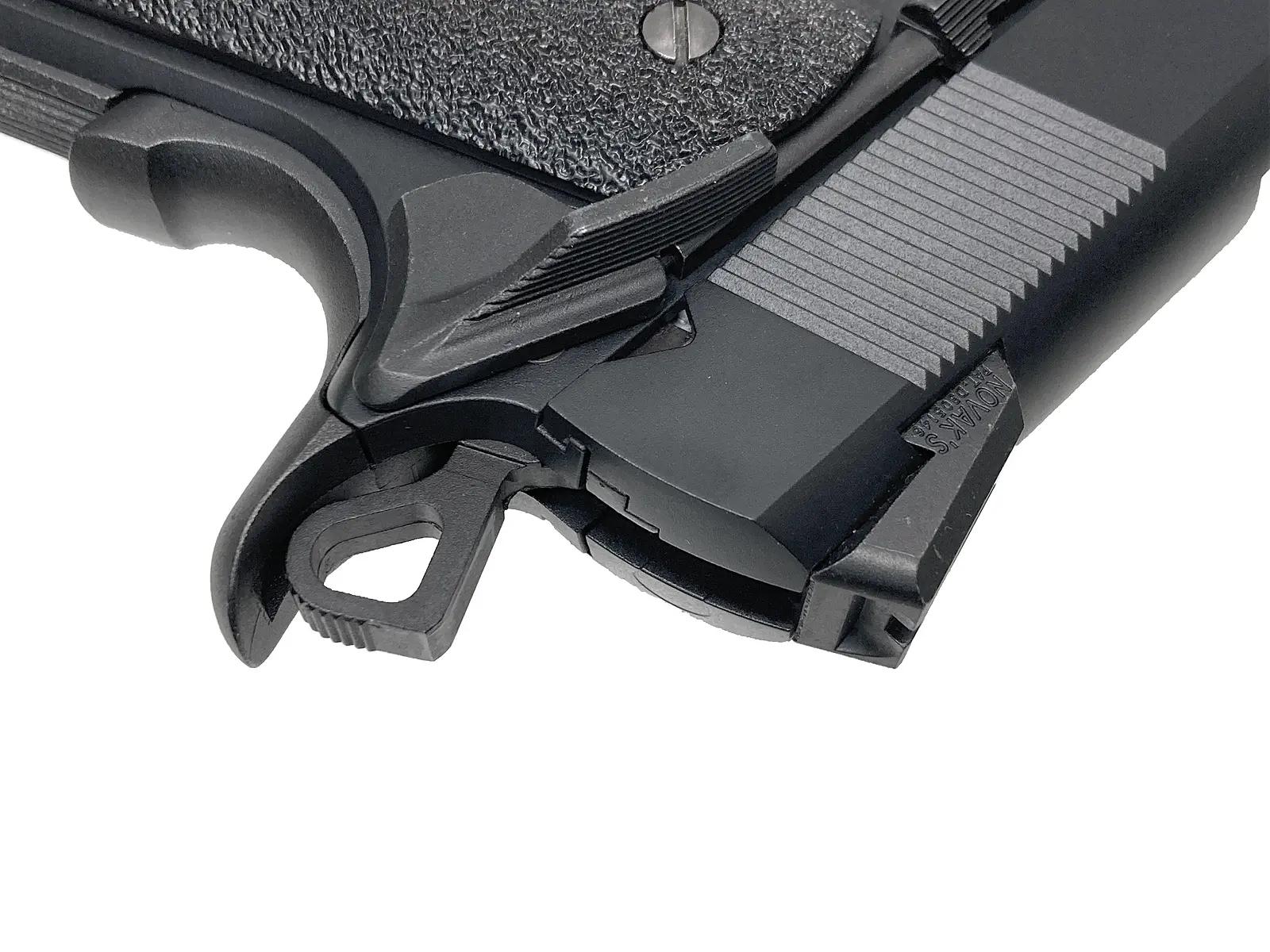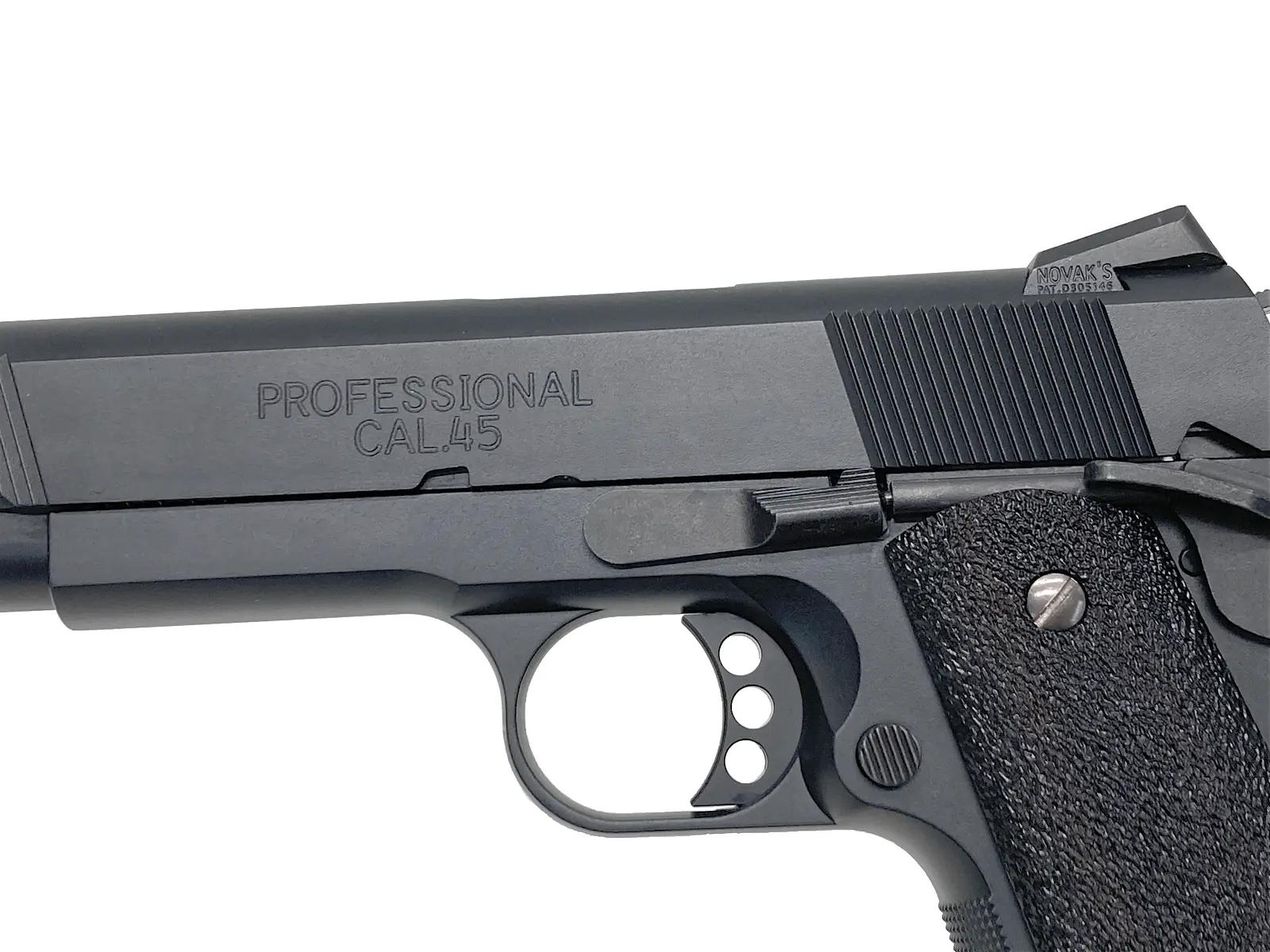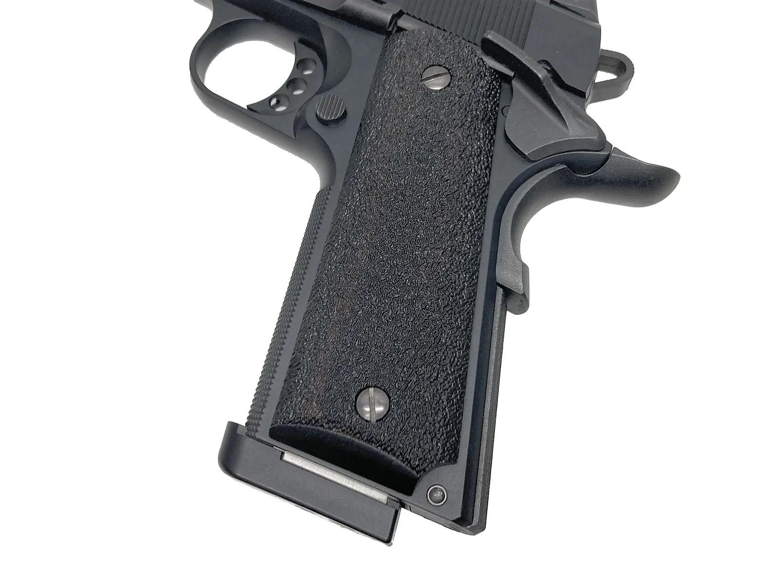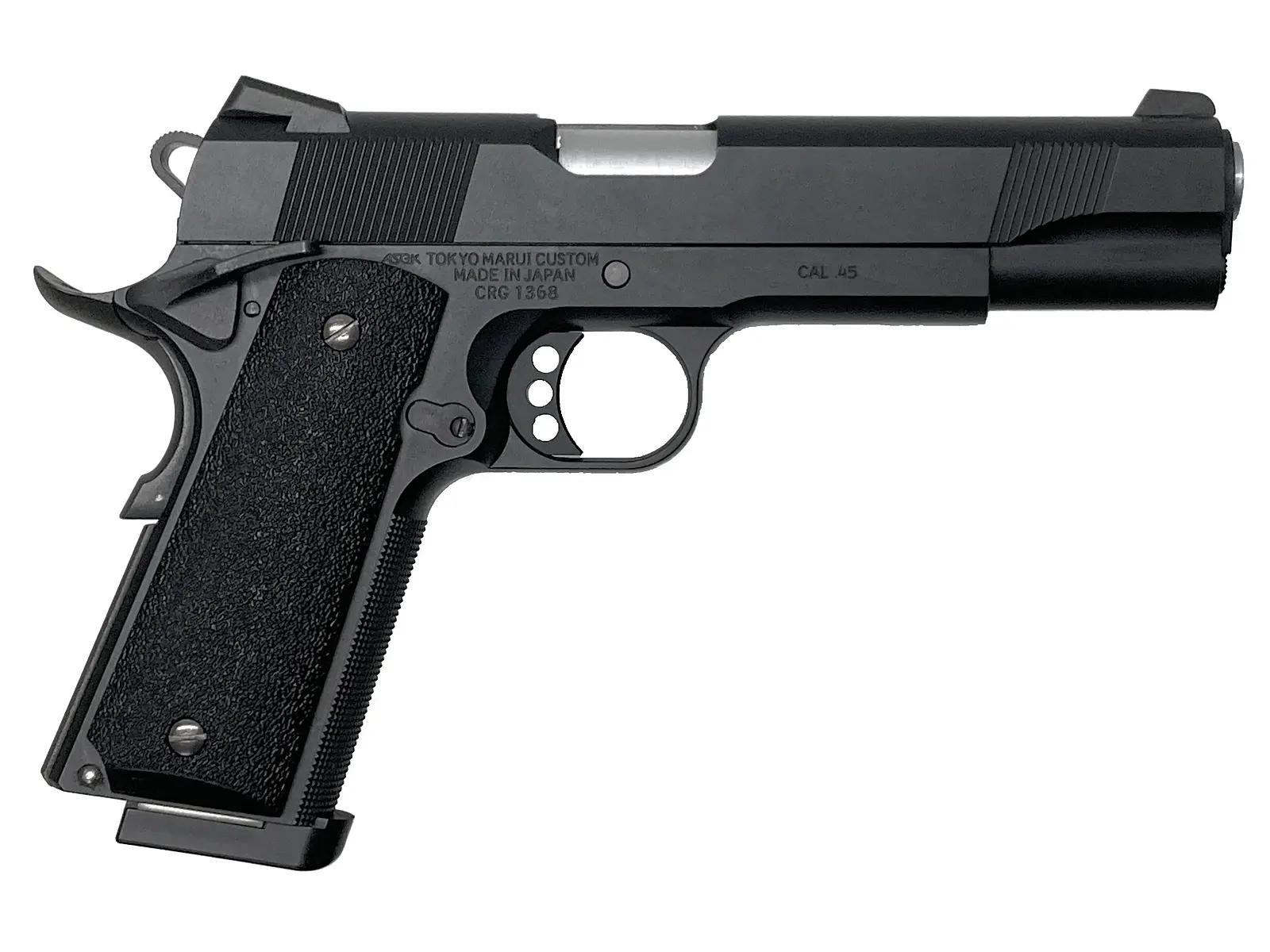 アメリカ海兵隊の精鋭が愛用するカスタム1911を、東京マルイがその高い実射性能と徹底した外観のこだわりでモデルアップ。本体には落ち着いた質感のブラスト仕上げを施し、反射を抑えた軍用銃らしい無骨な風貌を再現。さらに、ノバック社との正式ライセンス契約による金属製リアサイトを採用している。パーティングラインを消し込む念入りな仕上げが施され、箱を開けた瞬間の所有感から実射時の命中精度に至るまで、ハイレベルにまとまった名作だ。