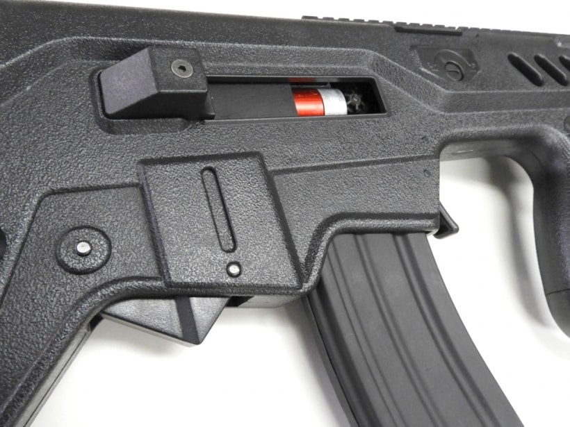 [S&T] Tavor-21 / タボール21 フラットトップ スポーツライン BK (中古) 製品参考画像5 コッキングすると、ポートカバー開放状態でロックされるのでホップダイヤルの調整がやりやすい。ポートカバーを閉じるときはマガジンの後方にあるボルトリリースボタンでできる。