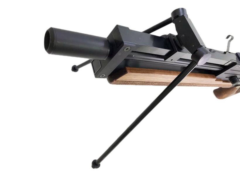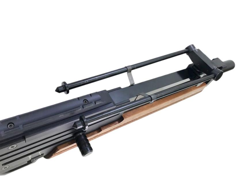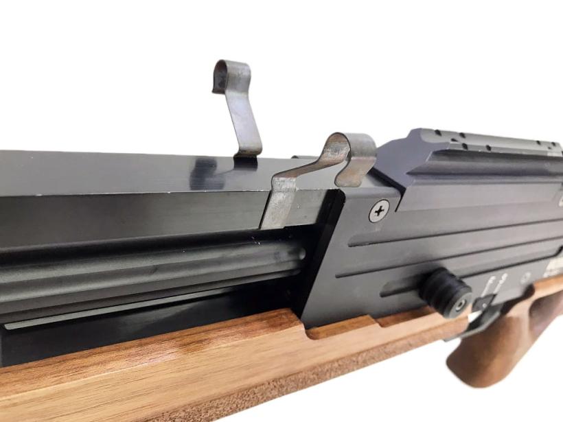 ブルパップ方式に加え、吊り下げ型のバイポッド、表面のフルート(溝)によって表面積を増やし放熱効率を上げたフルーテッドバレル、バレルに干渉しないようバレルの上下にある2本の金属レールにハンドガードなどのパーツが取り付けられていたりと、数々の奇抜なアイデアはさすがワルサー社といったところ。