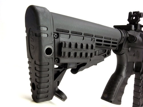 CBSストック。こちらのサイドレイルに別売りのACP(アジャスタブルチークピース)などの20mmアクセサリを取り付けられます。レイルは左右付け替えが可能。