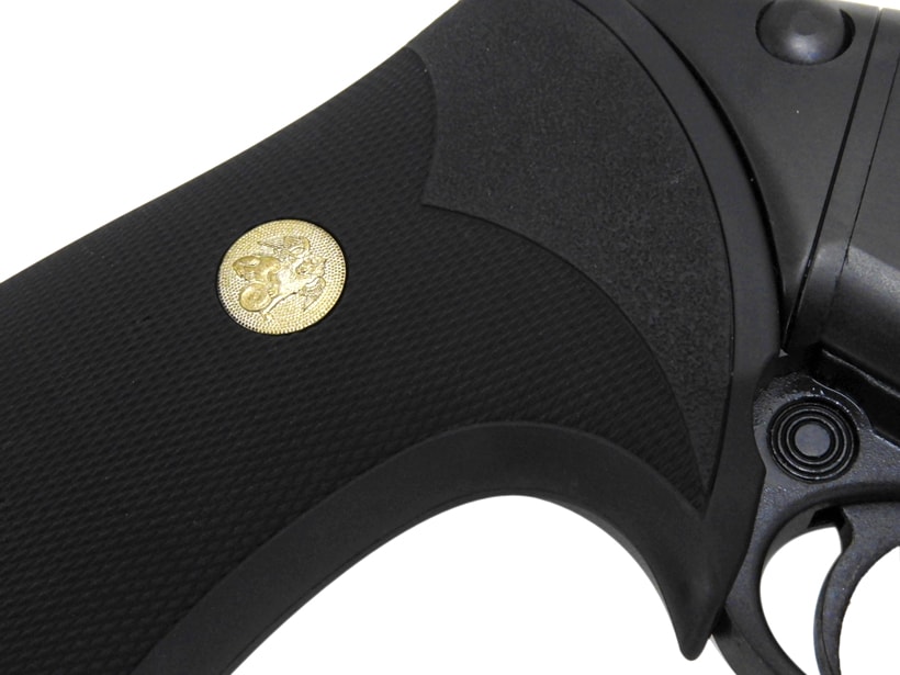 チェッカリングが刻まれたピストルタイプのグリップには、滑りにくいラバー塗装を採用。左右にゴールドカラーのメダリオンが埋め込まれています。