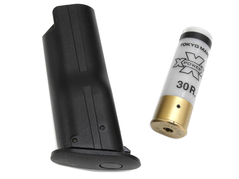 装弾数30発、実物ショットシェルを模したリアルなマガジンが付属します。※エアーショットガン用ショットシェル型マガジンも使用可能です。