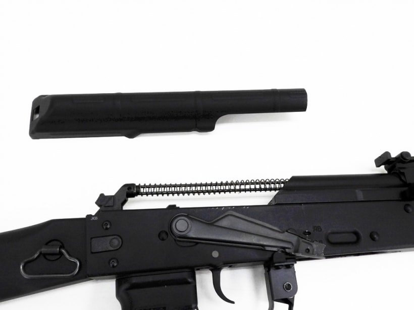 カバーが無くても射撃は可能で、ボルトキャリアーから伸びたピストン構造がガスチューブを通過するのが確認できます。