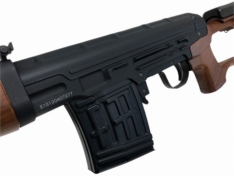 スチール、亜鉛合金、ウッドパターン樹脂ストックを採用したドラグノフ。サイドマウントはもちろん実物スコープ搭載可能なリアルサイズ。電動ガンのためセミ/フル切替可能。