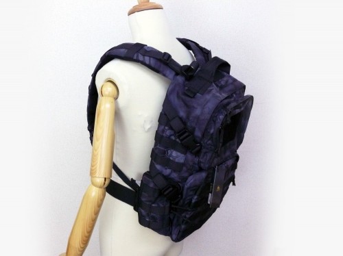 ナイトOPS ローライト配色 "Typhon"迷彩パターンのバックパック。豊富なポケットと収納スペースを持ち、調整用のベルトも備える。防水性で、様々な用途であらゆる状況に使用可能。