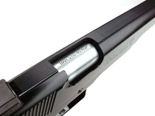 ぬらっと伸びるロングバレルに、存在感のある大きなエジェクションポート。BARSTO刻印のメタルチャンバーが覗きます。