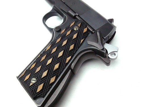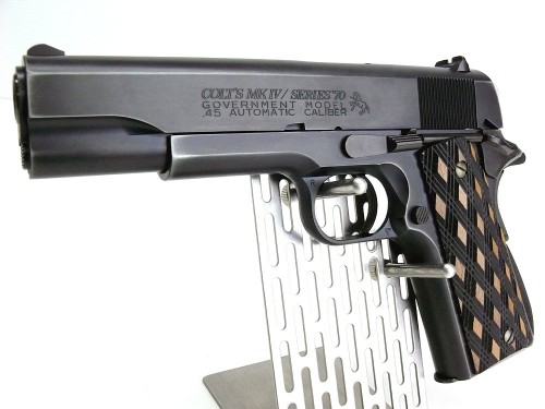 [WA] コルト MKIV シリーズ70 ハードトゥキル/リアルスチールフィニッシュ ガスブローバック (中古) 製品参考画像4 特徴的なスキップドチェッカー・グリップ。こんなに目立つ実銃用グリップをはめても他の部分の存在感が負けないところがWAのすごいところです。