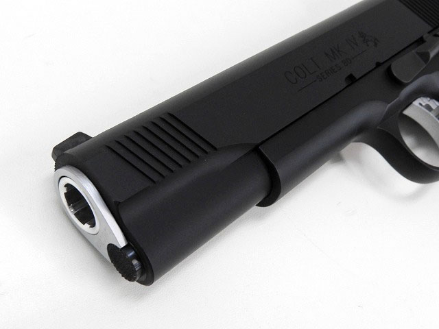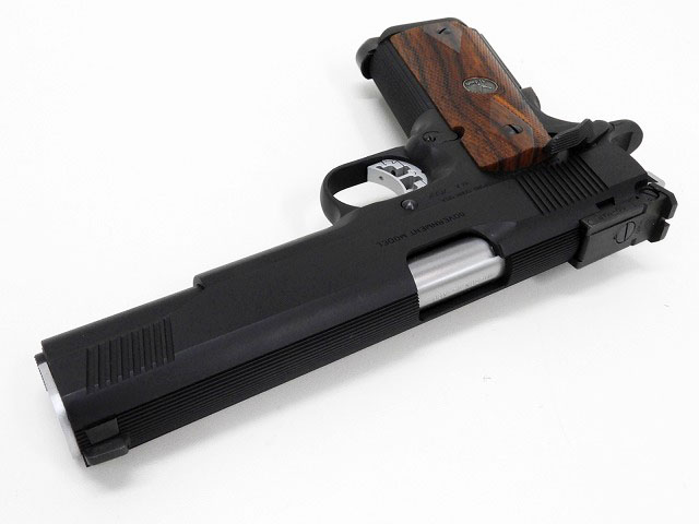 シブヤ カスタムワークスのガバメントカスタム。ボーマータイプのリヤサイトや、マグウェルにマガジンバンパー、シルバーのブッシングが特徴的。