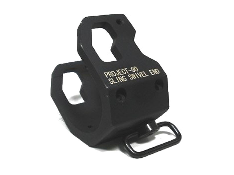 特殊な外観形状のP90でスリングの取り回しを安定させるスイベルエンド。 サイドとボトム部分に脱着可能なスリングフックが取り付け可能。