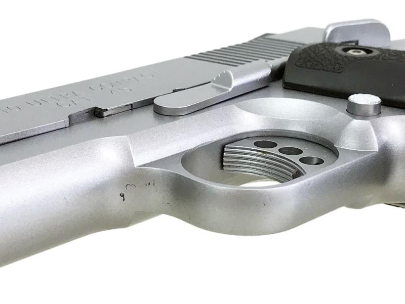 スライド先端のラウンド加工された穴からのぞくアウターバレルの10個の穴が特徴的。スプリングフィールド・アーモリー社が開発したコルトガバメントベースのコンパクトモデルでありその刻印も再現されている。 従来のホワイトが強調されたシルバーカラーとは異なり、トーンを抑えた渋めのブラッシュドステンレスカラーと小物パーツ類を包むブラックカラーのコントラストは、非常にシック。