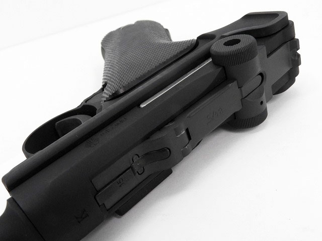 P08の最大の特徴であるトグルアクションもガスブローバックで見事に再現されている。ただ慣れていないと 通常のオートマチック拳銃のようにエイミングしていると、跳ね上がるトグルに驚くことは間違いない。