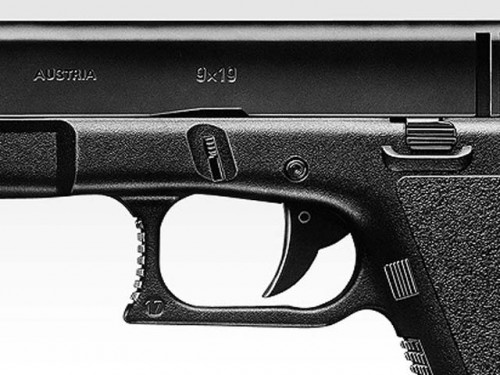 [東京マルイ] グロック17 ハイグレード (中古) セフティ搭載 本体左側面のレバーでセフティをかけるとトリガーが引けなくなり、誤射を防止します。また、トリガー前方のスイッチを押しこまないと発射できないトリガーセフティの機能を再現しました。