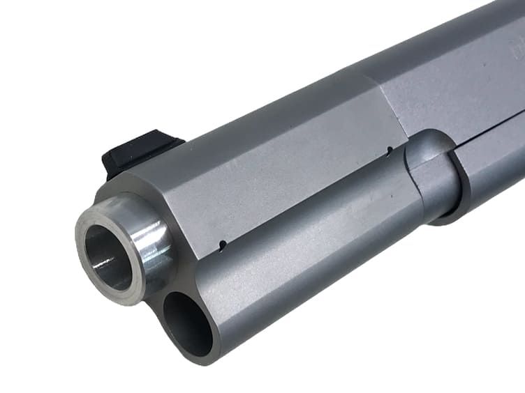 スライドは専用の刻印が彫り込まれた他、後部が大胆にカットされたデトニクスモデルならではのスタイルを、機械加工により製作しました。 アルミを削り出して製作されたバレルウエイトやマズルも迫力満点!