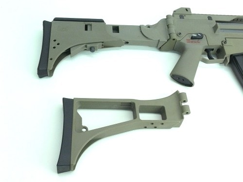 [UMAREX] NEW G36CV 電動ブローバック DE (中古) 製品参考画像2 伸縮タイプのVストックの他、通常タイプのストックも付属します。用途や好みに合わせて付け替え可能です。