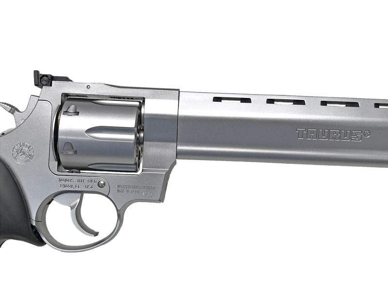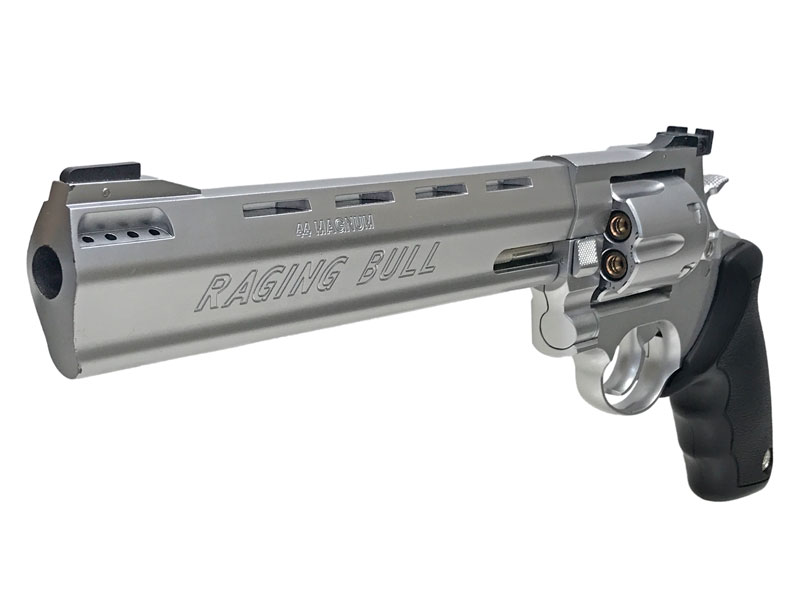 ブラジルのタウルス(英語読みではトーラス)社が開発した大口径リボルバー。  外観としては、放熱冷却用のベンチレーテッドリブと、反動を抑えるフルレングスアンダーラグ、そしてバレル側面に大きく描かれた「RAGING BULL」の文字が特徴的。マズル付近にはコンペンセイターの役割を果たす8つの小さな穴(エクスパンションチャンバー)が設けられている。  マグナム弾の発射に耐え得るようにシリンダーは2点保持されており、ハンマーの後部には、キーの所持者以外は解除できないロックによるセイフティが掛かるなど、機能面、安全面でもしっかりしている。それでいて、値段はリボルバー界の大御所であるS&W社のものとさほど変わらない。  流線型による美しさと破壊力を兼ね備え、大口径主義のアメリカを見据えたこの銃はそれなりに成功し、下請企業だったタウルス社は一躍有名になった。  ちなみに、モデル名は口径、仕上げ(Stainless Silver or Black)、バレル長さ(inch)の順で表されている。
