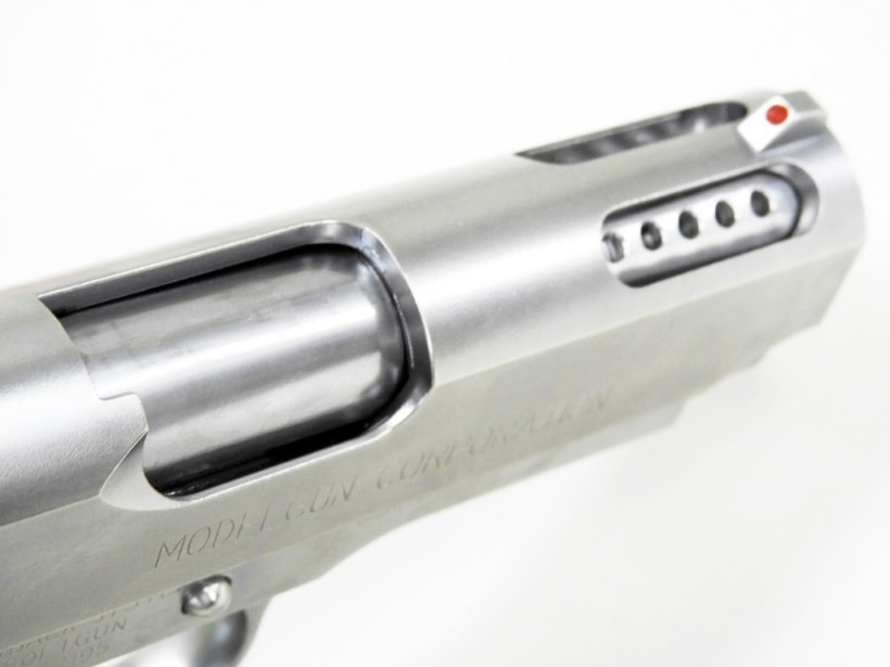 スライド先端のラウンド加工された穴からのぞくアウターバレルの10個の穴が特徴的。スプリングフィールド・アーモリー社が開発したコルトガバメントベースのコンパクトモデル。MGC製のステンレスシルバー。