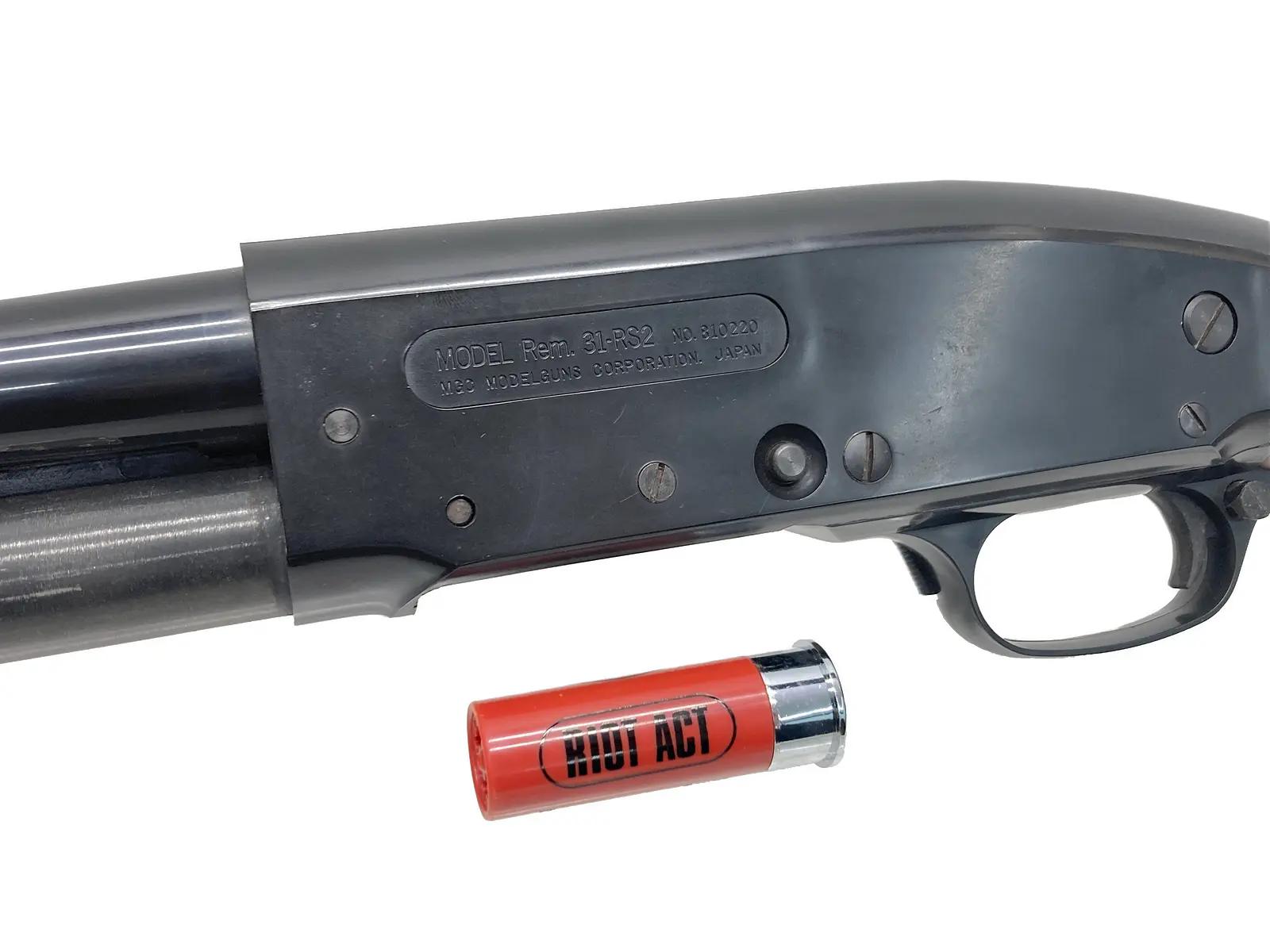 ポンプアクション式ショットガンのモデルガン。人気の高いM31、木製ストックモデル。標準でシェルカートリッジ6発付属。