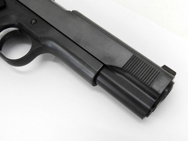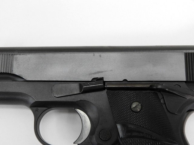 スパーハンマーはチェッカリング仕様またノバックタイプのリアサイトもしっかり大きなナイスサイズ。サムセフティは、機械加工で形状を整えた"ワイドサムセフティ"。サイドのラインがビシー!っと決まったスライド部分。コッキングセレーションや、サイト取付け用の溝も全部機械加工で再現。トリガーもリアルサイズ。加工で施されたフレームのリーフカットも、全体の雰囲気をビシッと引き締めている。スライドは側面のみポリッシュ。そんなスライドは、右も左も無刻印というコダワリ。