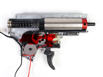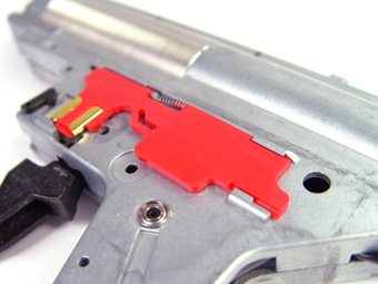 電動ガンのセレクター部分と連動しセミ、フル、セフティの切り替えを行うセレクタープレートを自己潤滑性・耐熱性に優れた素材を使用する事でセレクターチェンジをスムーズにし、そしてスプリングピンの形状変更によりピンの耐久性も向上しています。