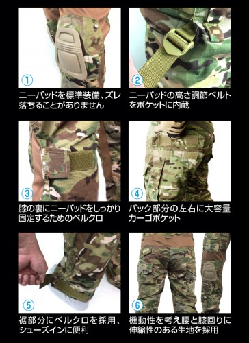 ●ニーパッド付きのスリムなコンバットパンツ登場! ●メンズにもご要望の多かったブラックカラーが登場! ●膝をついた射撃体勢や万が一の転倒時のダメージを軽減!!