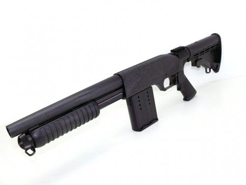 LAE(ライブアモエジェクト)を採用したライブカートショットガン。 発射して次弾を装填する際に、小気味良い排莢アクションが楽しめる。カセット式ライブカートマガジンには10発x2セットが装填可能。