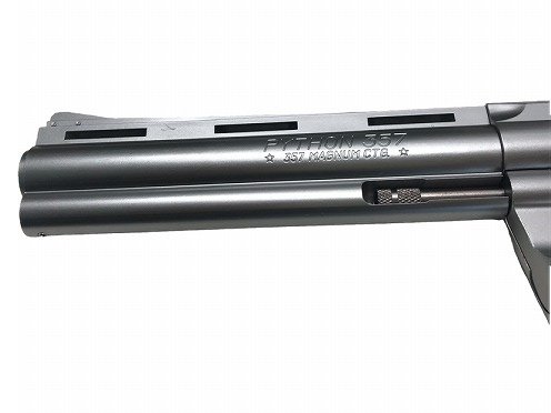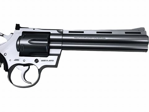 リボルバーながら24ショットシステムの採用により4発×6カート分の装弾が可能になっている。こちらは6インチのロングバレルモデル。現在では販売終了の絶版品となったパイソンの中でも希少なステンレスモデル。ホップアップは、「Vパッキン」を採用。命中精度と十分な飛距離を実現し、ガス漏れを防ぐ「可動式ローディングノズル」を採用。