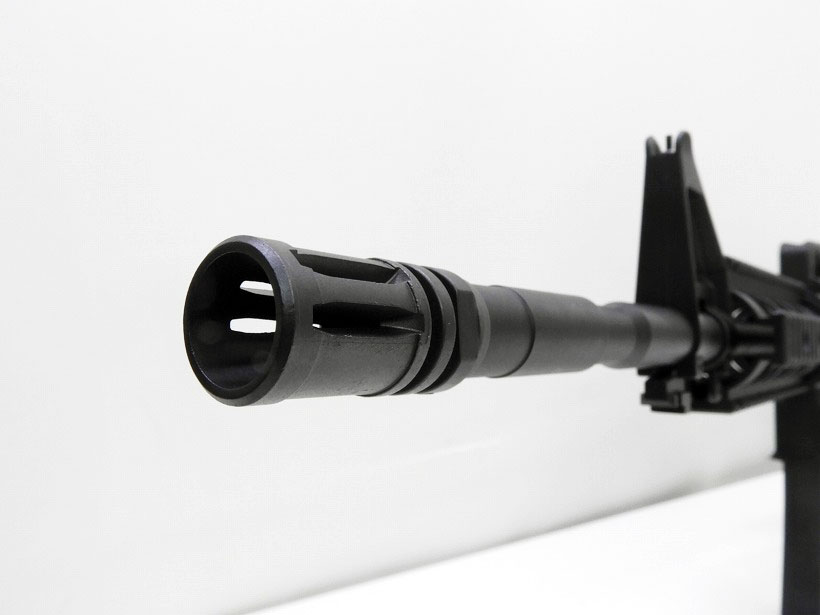 ●アウターバレルの固定は、実銃と同じく基部全体をバレルナットでガッチリと固定する方式を採用。AR系ライフルで重要な首周りの剛性を高めました。一体成型のアッパーレシーバーや精密チェンバーと相まって、高い命中精度を実現しています。