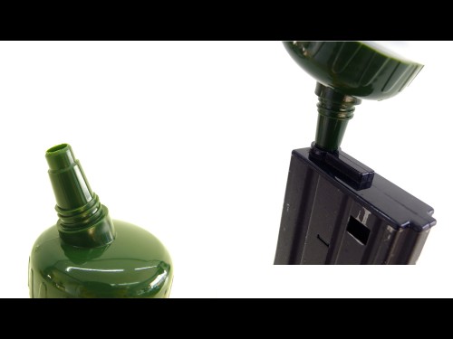 ノズル(弾の出口)に一工夫してあり、電動ガンマガジンにすっぽりはまります!マガジンから弾を取り出したい時にはこうしてはめるだけで、内部スプリングによりズアーッと上がってきた弾がそのままボトルに収納されるのでとても便利。
