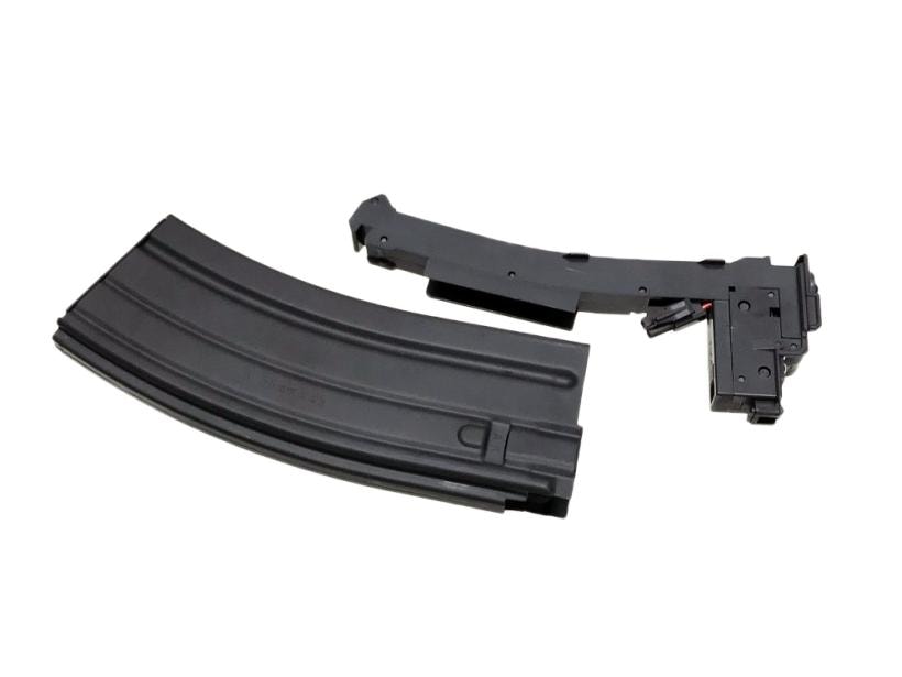 装弾数30発、マガジン内のバッテリーから本体への電力供給が可能な、ヒューズ内蔵のバッテリー格納式マガジンが付属。※外装式バッテリー使用時は、バッテリーを外した本マガジンおよび他モデルのマガジン(対応オプション&サプライ参照)が使用可能です。