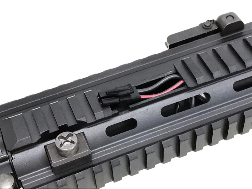 付属のバッテリー格納式マガジン、または別売のAN/PEQ-16を使用した外装式バッテリーいずれかの給電方法が選択可能。レイルハンドガード右側面にあるトラップドアからコネクターを取り出せるので、外装式バッテリーとの接続もカンタンです。※バッテリーは、必ずどちらか一方のみに接続してください。