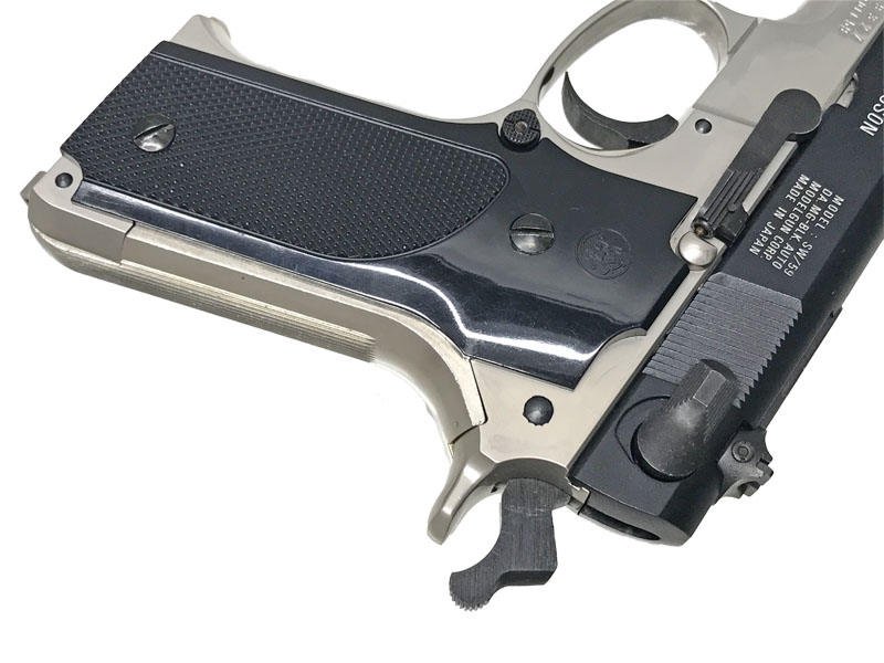 S&W初のセミオートハンドガン、S&W M39のダブルカラムモデルがM59。人気の高いMGCのフレームシルバーモデル。