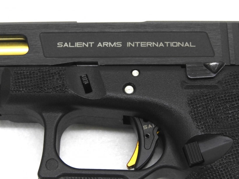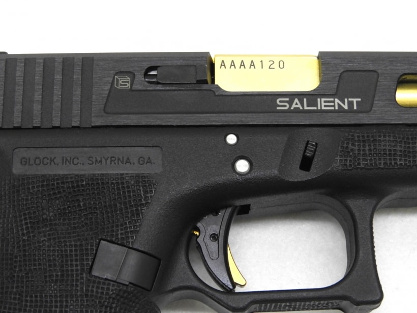 ステッピング加工のフレーム、大きく肉抜きされ、黒く光沢のあるスライド、フラットトリガー、ゴールドアウターバレル。スライドはクッキリとしたロゴと文字のレーザー刻印、深々と刻まれたセレーション。異彩を放つG17SAIカスタム登場。スライド、アウターバレルはもちろんメタル製。ノーマルのアウターバレルも付属。