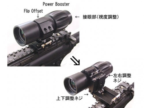 1倍のドットサイト等と併用して倍率を追加するパワーブースター。標準付属のオフセットマウントはフリップアップするため、倍率がいらないときはブースターを跳ね上げ、一瞬でドットサイトに切り替えることが可能。