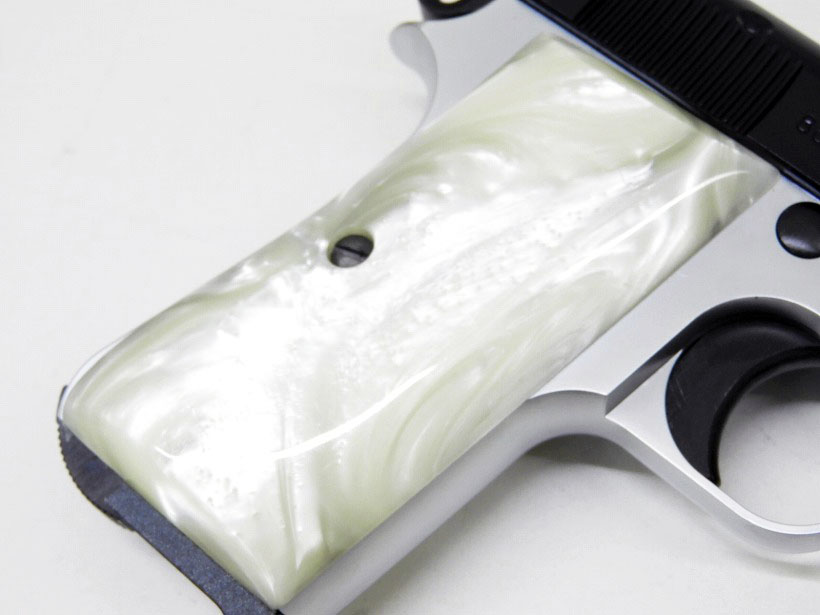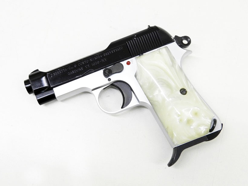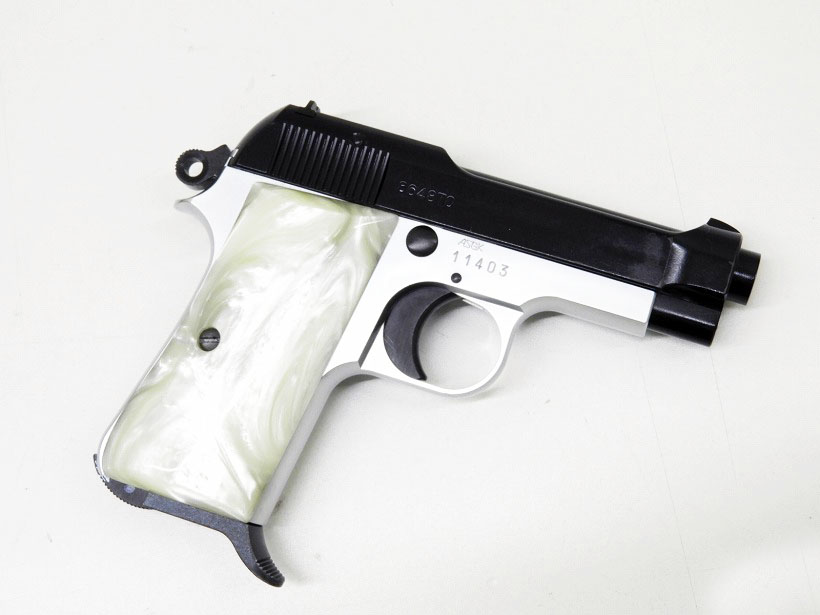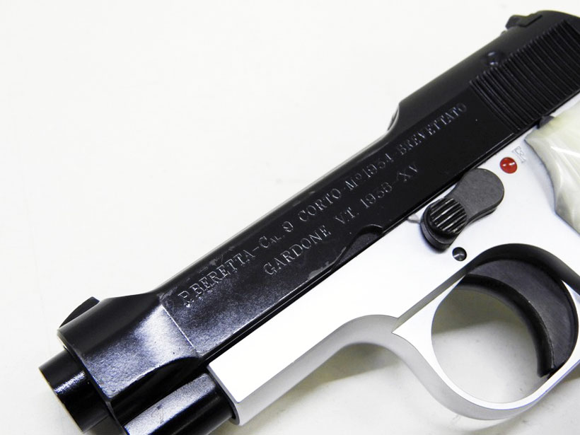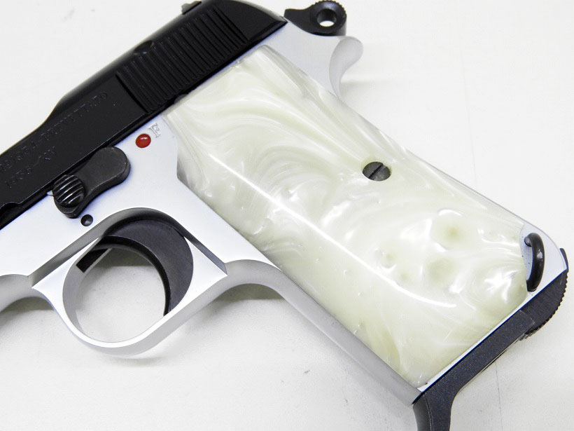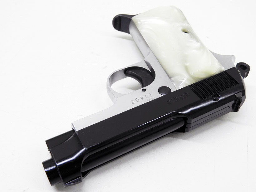 ABS樹脂製のフレームパーツに、つや消しメッキ仕上げを施し、さらに実物グリップメーカーAJAX社に特別発注された、ホワイトパーライトグリップを装備することで、華やかで上品なM1934に仕上げました。スライド刻印は彫刻機によりリアルに再現されております。
