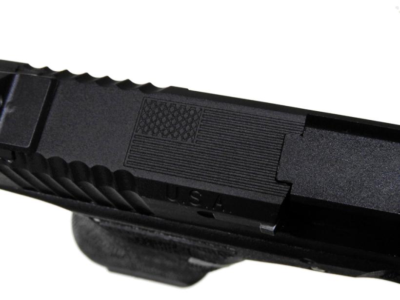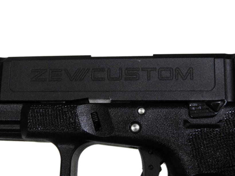 スライドは独特なカッティングのセレーションが特徴のトリロバイト(※三葉虫の意)スタイルで、ZEV CUSTOMの刻印入り。上部にはアメリカ国旗があしらわれており非常にリアルな造り。フレームは金型によるモールドながらスティップリング(ホットツールによる滑り止め加工)が施された実銃のスタイルが再現されています!
