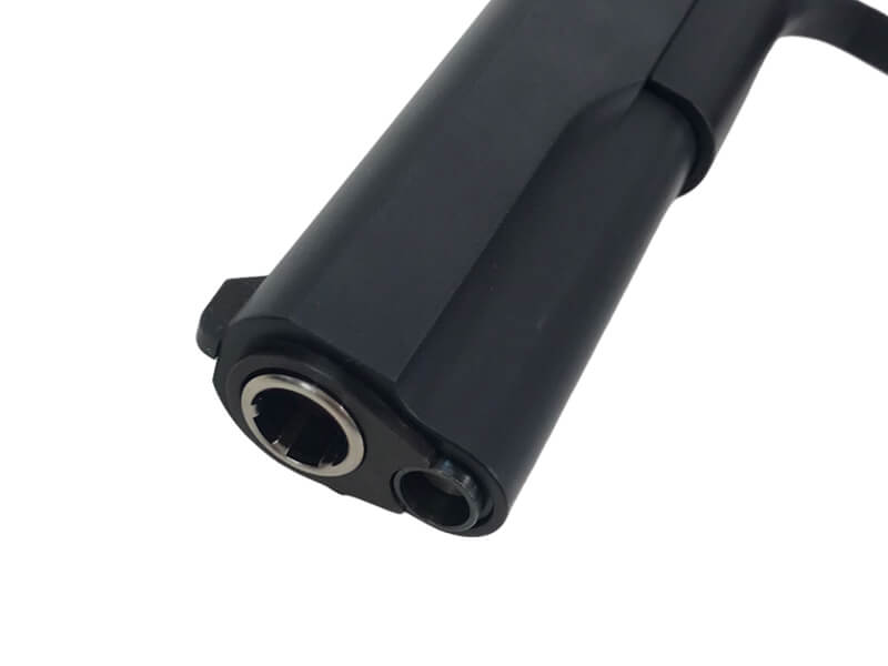ハードボーラーのような長いスライドが特徴的。スライドはカーボンブラック使用で使い込まれた鉄のような風合いを出している。