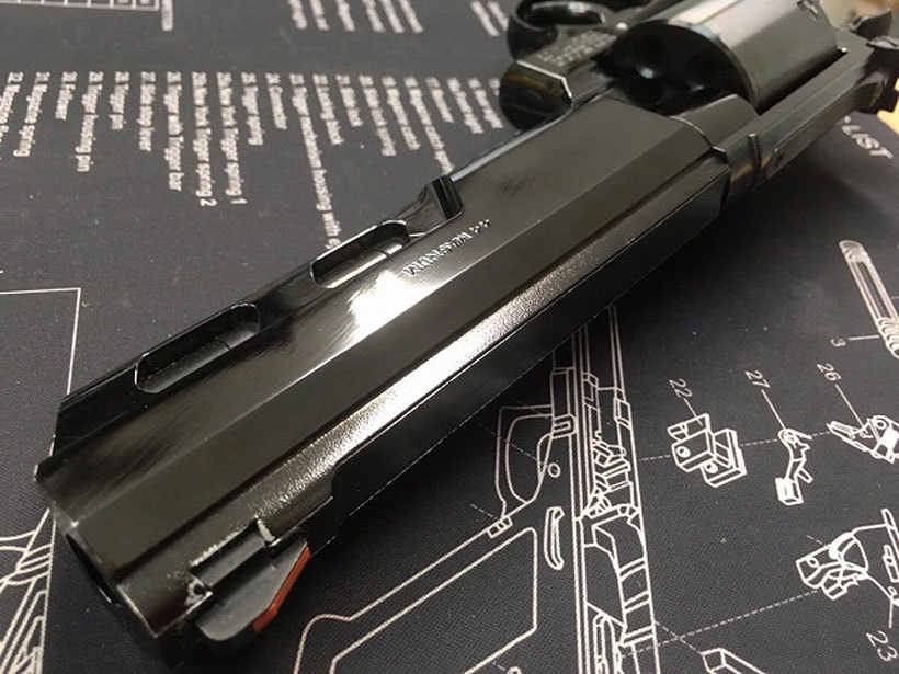 ミッドナイトブルーという名称通り、ブルーイングされたような深く青みがかったブラックがきれいなモデル。シリンダーもノンフルート仕様となっている。