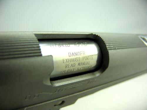 まず印象的なのが5つのマズルポートが開いたコーンバレルとそれを受け入れるスライドの構造だ。かみ合う部分はNC旋盤によって正確に加工されており、隙間なくきれいなツライチになっている。手に取るとさすがに1キロを超えてくる銃なので重さを感じる。大柄のマガジンウェルや交換可能な肉抜きトリガーシュー、マズル先端まで伸びたシャーシは存在感を引き立たせている。バレルはコーンバレルになっており、形は特徴的だ。また射撃性能はというとバルブロックシステムによりブローバックの最後の一押しまでガスを放出させるシステムを採用しブローバックの衝撃をもろに受ける。衝撃がきついのはマルイのデザートイーグルなどが思い当たるが、こちらは重金属がそのまま衝撃を伝えてくるような感じなのでよりリアルな衝撃である。
