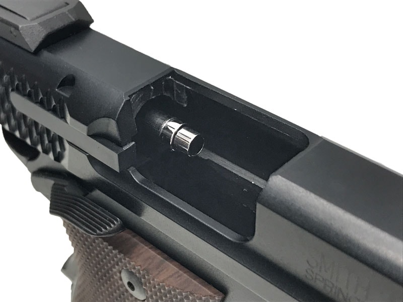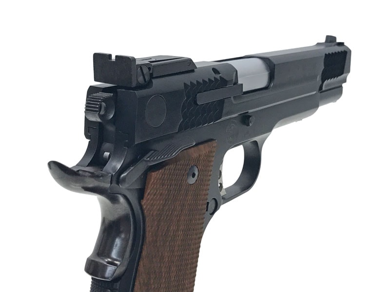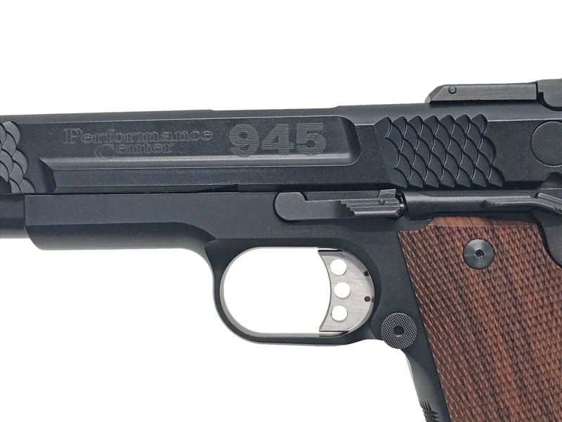 M945はコルトガバメントの設計が大元として使われているが、それは1986年にガバメントのパテントが切れたことによってS&W社がガバメントコピーの製作販売に乗り出したためである。単なるコピー品ではなく、リーベンバーグ氏率いるパフォーマンスセンターの手によって、新技術がふんだんに盛り込まれている。スライド側面のスケイルドセレイションなどは目を引くスタイルだ。