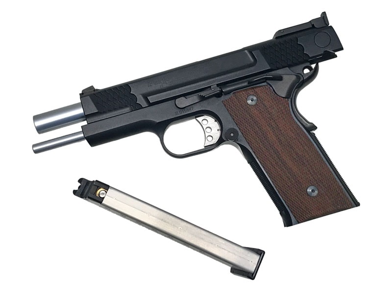 ハンドガンの場合は全体を金属性とする組み換え、エアソフトガンの場合は射出エネルギー0.98J以上にする改造を行うと銃刀法違反となります。HFC134a仕様のガスガンにCO2用マガジンを組み込む、スライドを金属製の物に差し替える等、簡易な改造でも罪に問われる可能性がございますので、絶対にお止めください。