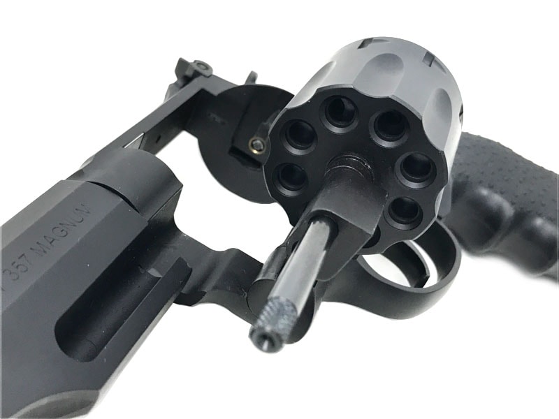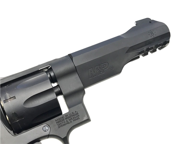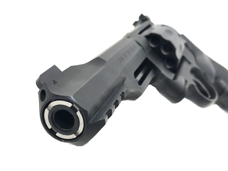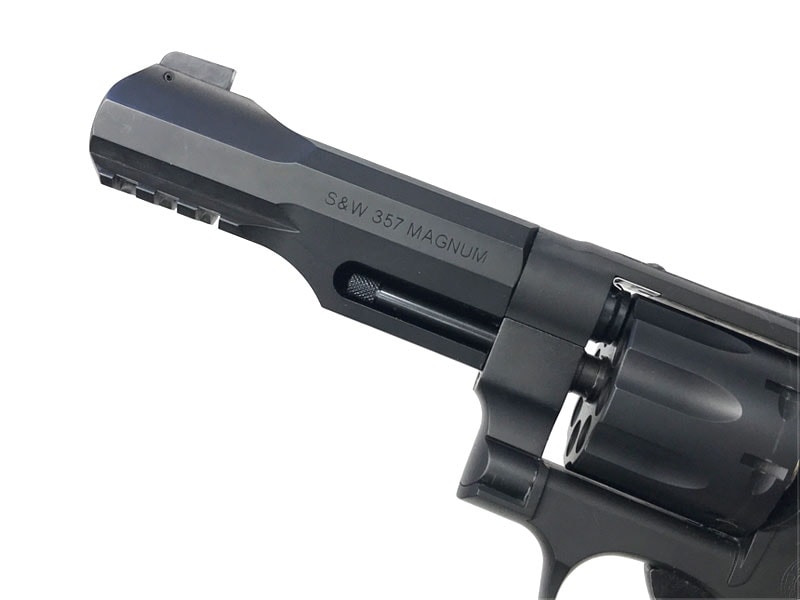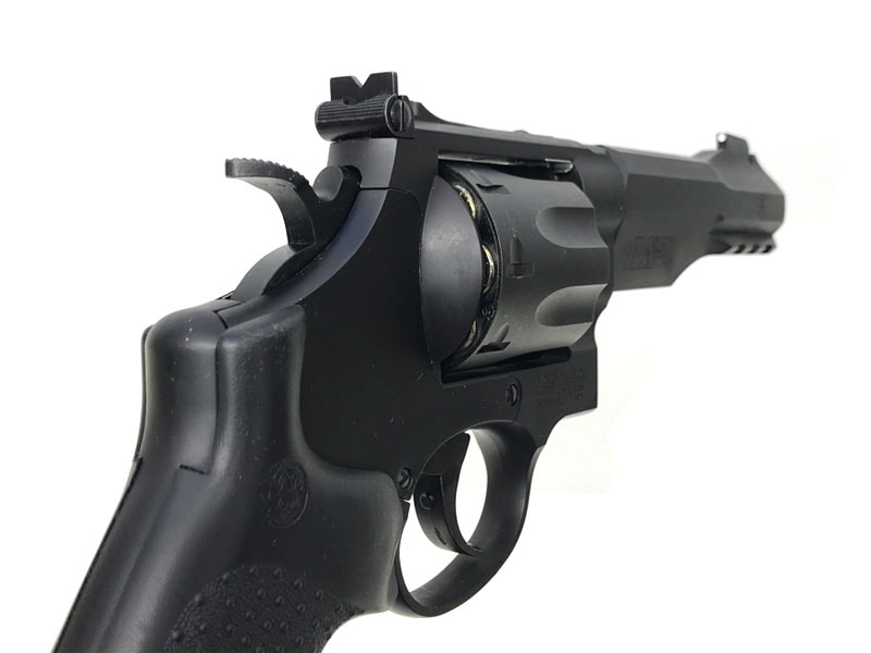 軍と警察(M&P)と名づけられたピカニティレールを装備するパフォーマンスセンター製作のタクティカルリボルバー。実銃は軍や法執行機関向けに設計され、装弾数の多い8ラウンドシリンダーなど、あらゆる状況に対応可能なセミオートに匹敵する能力をもつ拳銃。