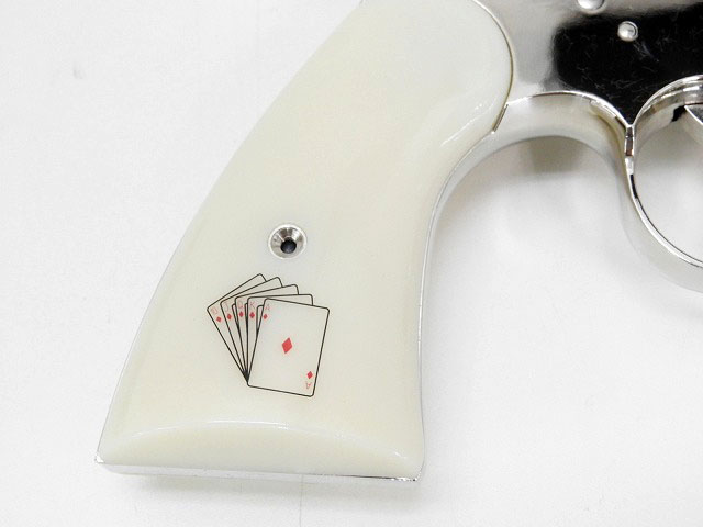 コレクターの間で超有名な、1989年に限定販売された“スネーク・アイズ”。底面にシリアルナンバーの入ったフレームと、「SNAKE EYES」刻印のレッドランプ付き2.5inchバレルを備え、アイボリー・グリップにはサイコロのゾロ目(蛇の目)と、ロイヤルフラッシュのポーカーハンドが刻まれています。
