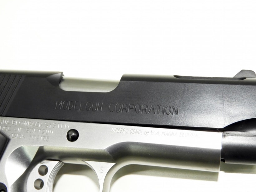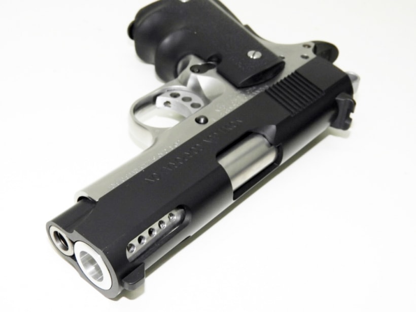 スライド先端のラウンド加工された穴からのぞくアウターバレルの10個の穴が特徴的。スプリングフィールド・アーモリー社が開発したコルトガバメントベースのコンパクトモデル。MGC製のフレームシルバーモデル。マグナブローバック正式ライセンス商品。