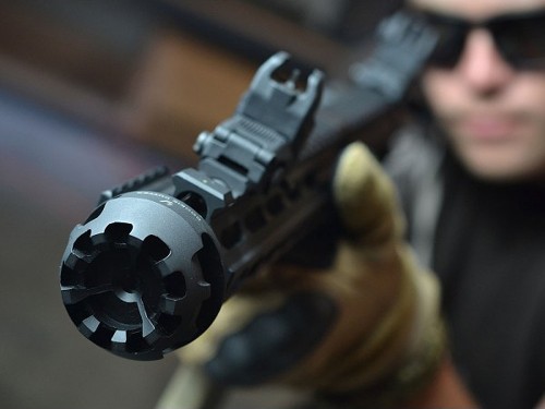 Strike Indusries社の「Cookie Cutter Comp」レプリカ。かなり奇天烈なデザインですが、ショートバレルのARに装着するととても馴染みます。