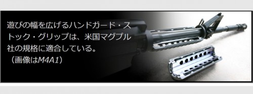 ●M4後期型で特徴的なのが伸縮式ストック。6段調整型でチューブにレーザー刻印が入った最新のフィーチャーを再現。アウターバレルは、ハンドガードで隠れる部分まで完全にへヴィーバレル仕様となり、ハンドガードは放熱効果が改良された大口径タイプ。プレス製ヒートシールドと、リアルなガスチューブを内蔵しています。(ハンドガードとストック・グリップ部分は、マグプル社の実物アクセサリーに換装することも可能)サイトはフルアジャスタブル式で、フロントポストは超精密スチール切削にて製作。付属のダミーカート型ポンチで、雰囲気たっぷりに微調整ができます。サイト基部に設けられたサイドスリングもM4カービンの特徴(グレネード装着を想定)ですが、さらにストック基部にあるプレートもサイドスリング対応型を装備しました。