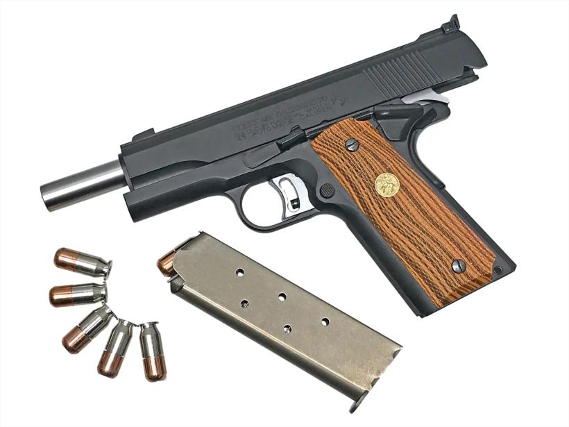 <実銃はこんな銃>ナショナルマッチモデルは標的射撃競技仕様で、特に精度の高い銃身が組込まれ、他の部品の組立て精度が高い。第二次大戦前のモデルは外見的には刻印以外はガバメントモデルと同一仕様であったが、戦後モデルになると、コルト社純正の可動照準器であるアクロサイトが装着された。