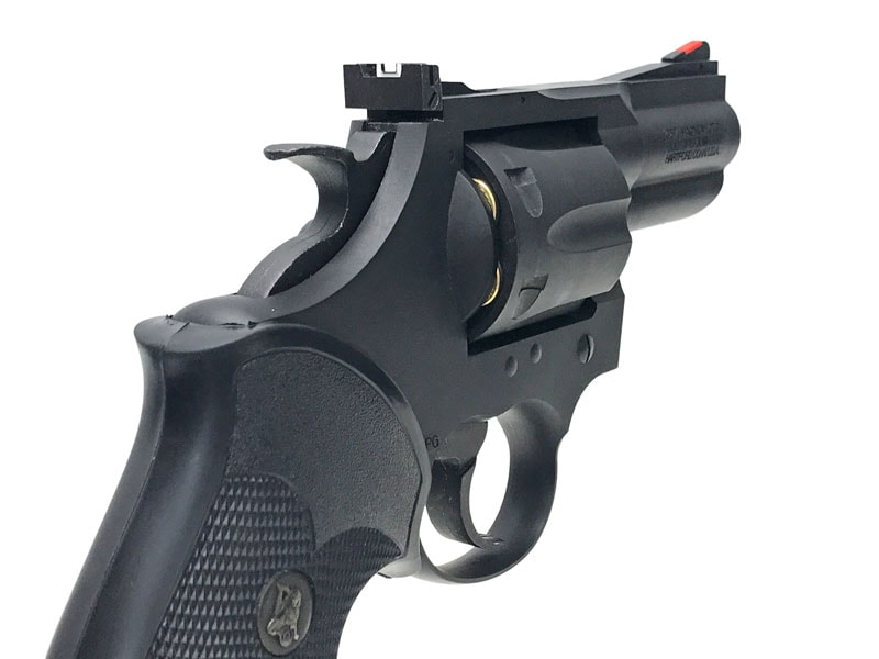トリガーメカやグリップが改良されたマークVリボルバーに、スタビライザー効果抜群のフルバレルシュラウドを装備する357マグナムの完成型がこのモデル。80年代のメーカー純正品としては珍しいダークテイストの刻印が強烈なキャラクターを主張している。KSCはリボルバーの最高峰を目標にパーツ1つの形状まで妥協しないリアリティを追求。製品にはダミーカートと見紛うリアルな発火カートリッジが6発付属する。実物グリップ標準装備!!